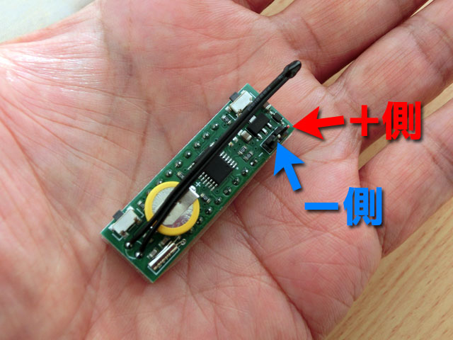 背面を見ると、基板上に、制御チップ、タクトスイッチが2つ、細長い発振子、丸いバックアップ用電池、温度センサー、そして電源コネクタ接続端子が見える。