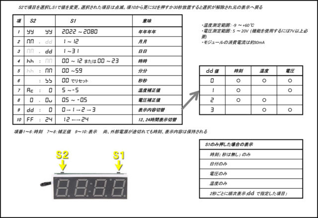 各設定は下記の表の操作でおこなえる。この表からわかるように、S1の操作で「温度のみ表示」にすることができる。