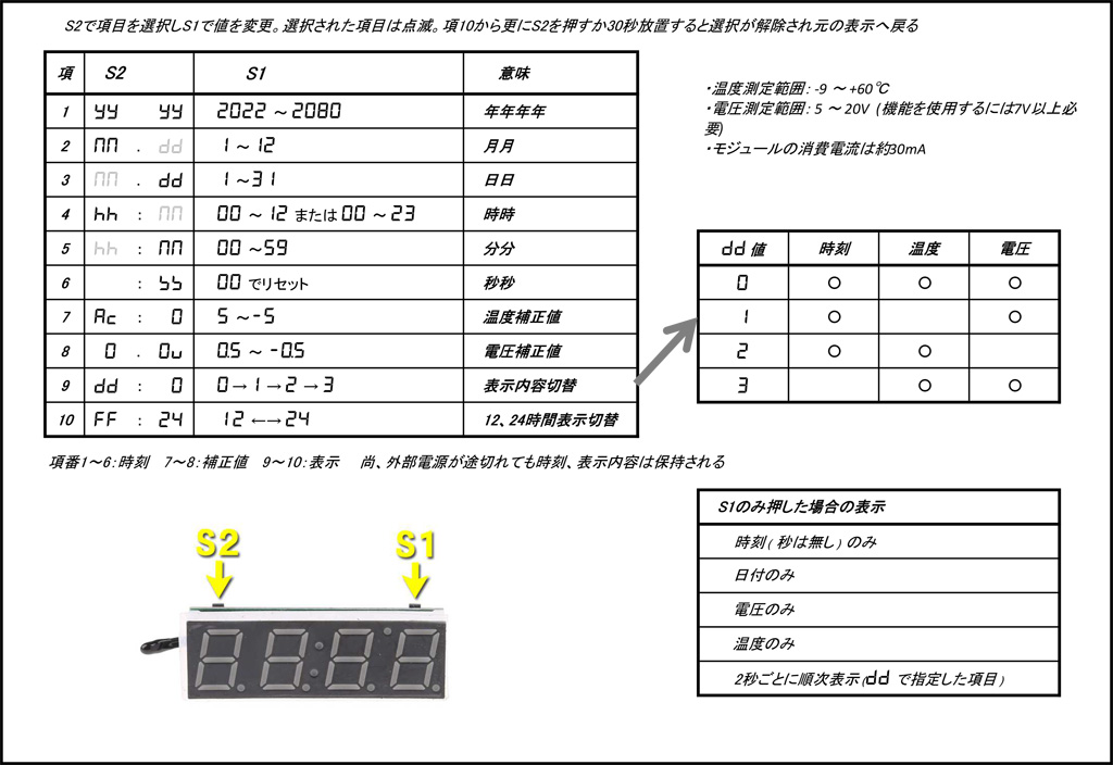 各設定は下記の表の操作でおこなえる。この表からわかるように、S1の操作で「温度のみ表示」にすることができる。