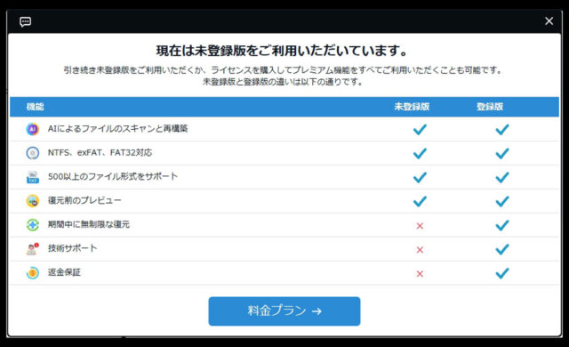無料版と正式版の大きな違いはデータ復元がおこなえるかどうかだ。