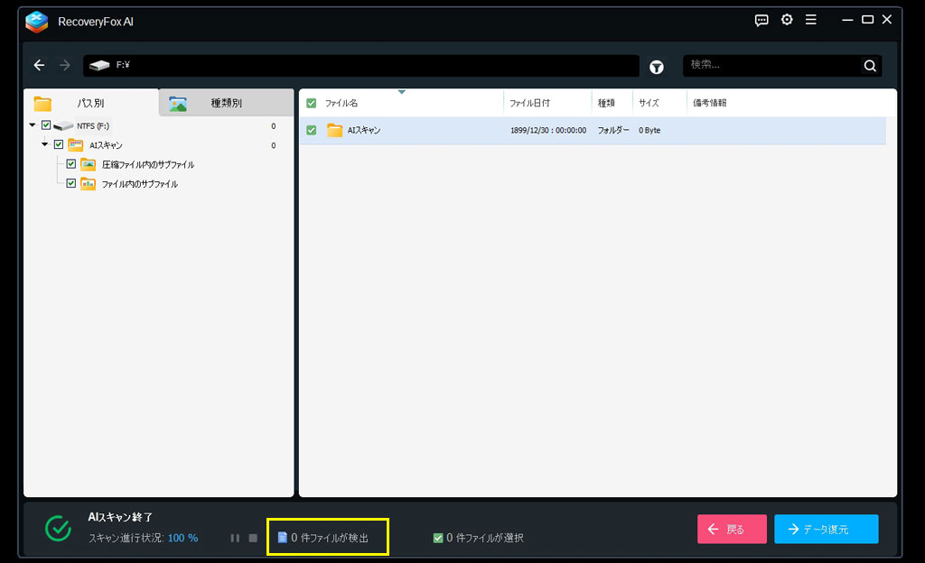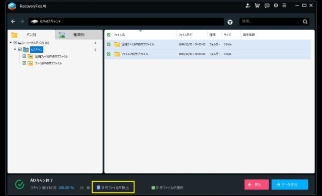 当然のことながらデータ復元の対象となるファイルの検出は0件。