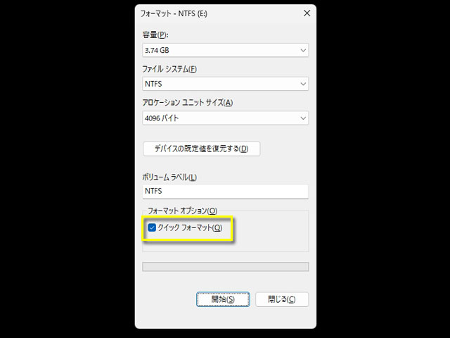 【フォーマッターのクイックフォーマットのチェックを外すとフルフォーマットになる】