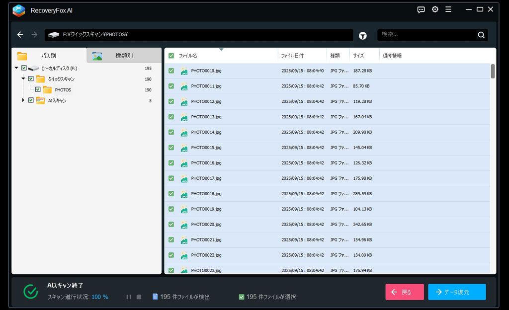 スキャンをおこなうとクイックスキャンで190個、AIスキャンで5個のファイルが検出され、これは復元することができた。