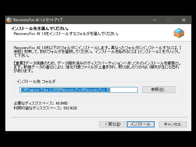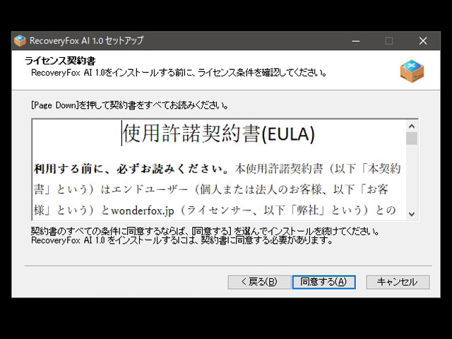 ダウンロードされたセットアップ用ファイル「recoveryfoxai.exe」を実行し、あとは以下の流れでインストールをおこなえばよい。