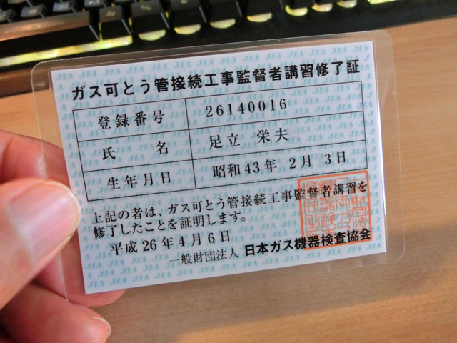 わしの場合は、なぜか「ガス可とう管接続工事監督者」の資格を持っている。