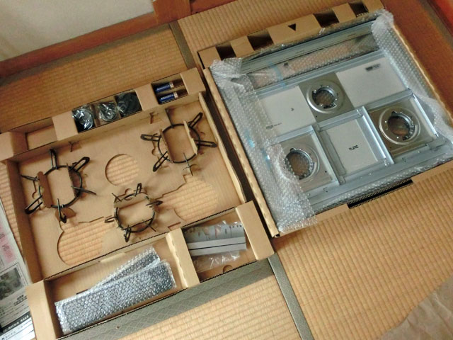 【届いたコンロ。意外と重いので、二人で持った方がよさそう 】