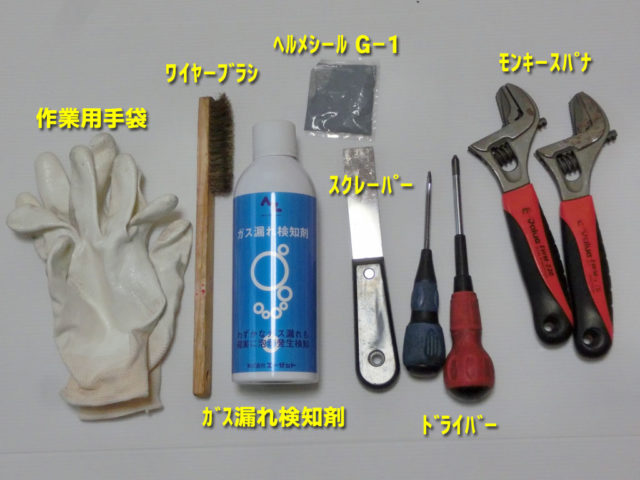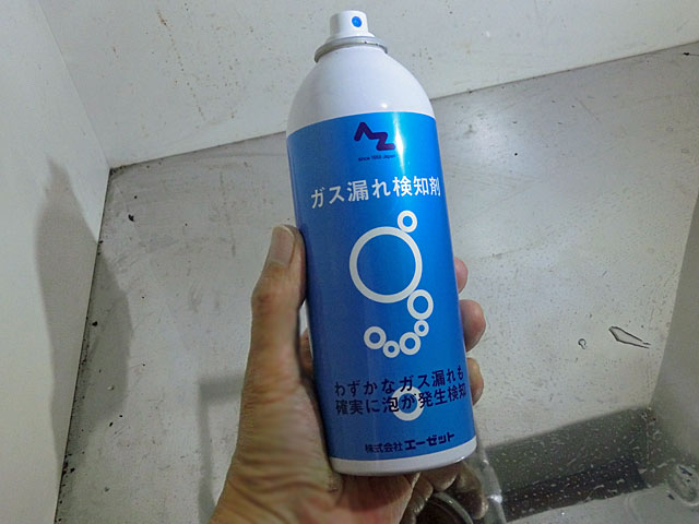 そして中央にあるスプレー缶は「ガス漏れ検知剤」だ。